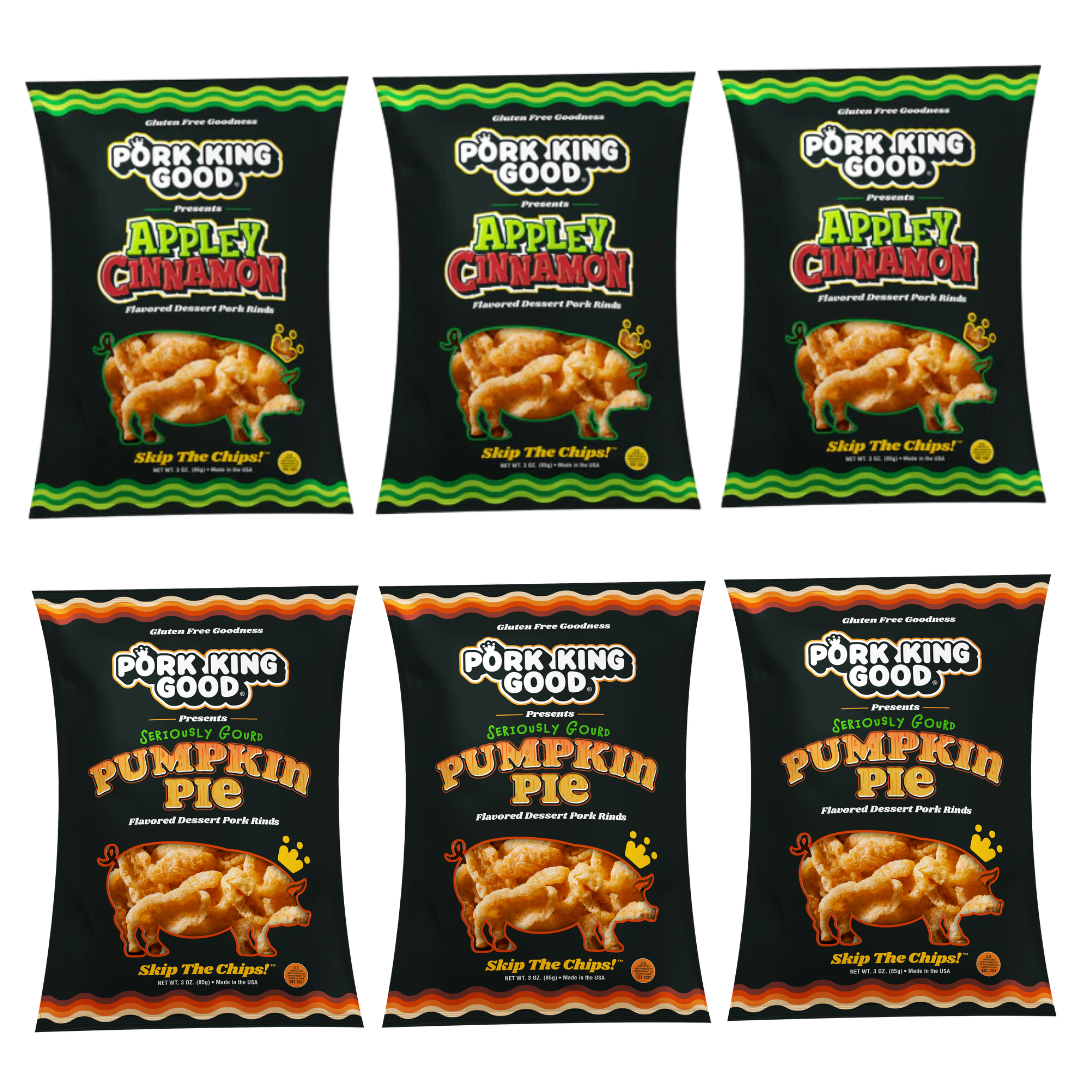 Pork King Good 6 Pack Fall Bundle! 3 Bags Each 3 oz Pumpkin Pie and Appley Cinnamon Pork Rinds (Limited Supply)