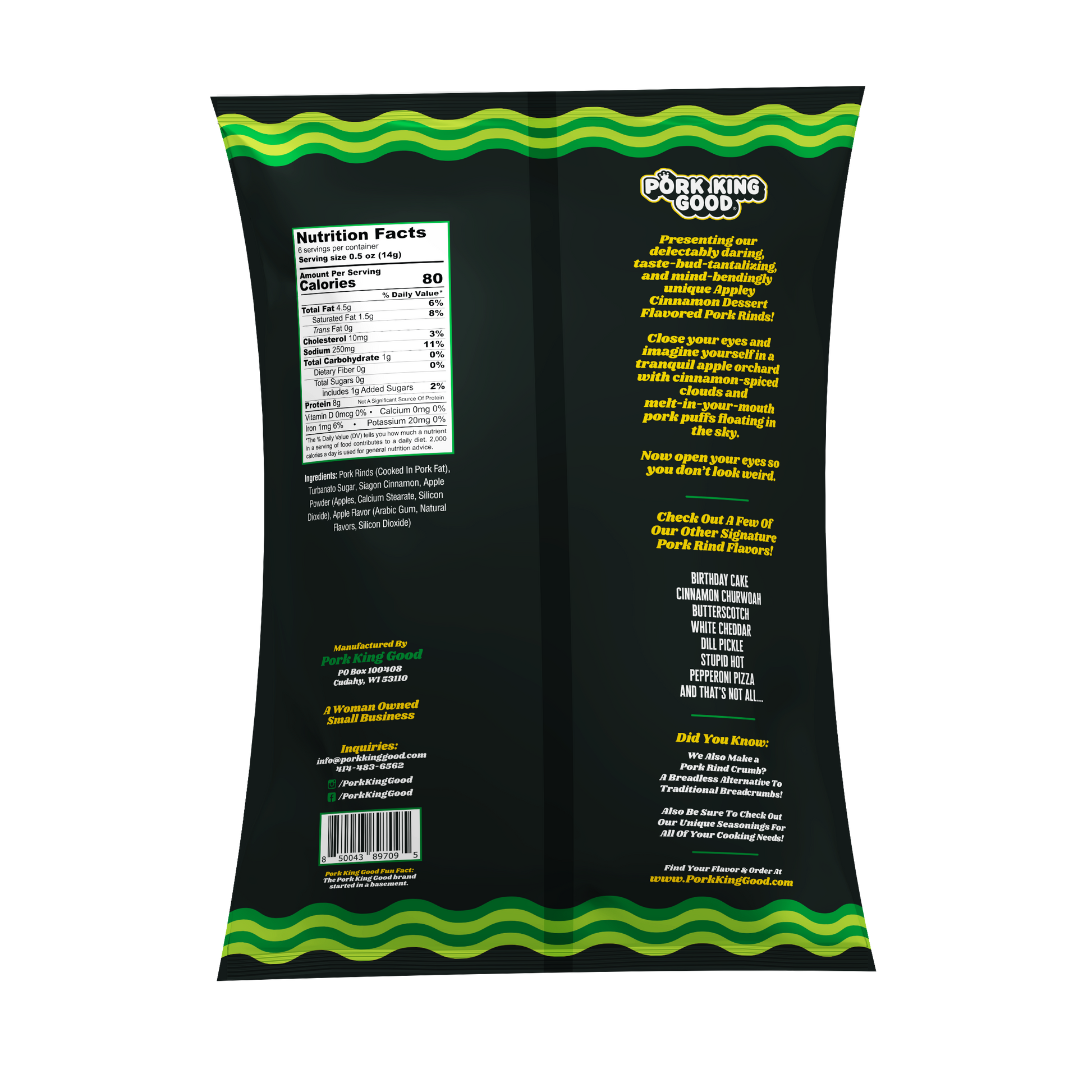 Presenting our delectably daring, taste-bud-tantalizing, and mind-bendingly unique Appley Cinnamon Dessert Flavored Pork Rinds! Close your eyes and imagine yourself in a tranquil apple orchard with cinnamon-spiced clouds and melt-in-your-mouth pork puffs floating in the sky. Now open your eyes so you donāt look weird.
