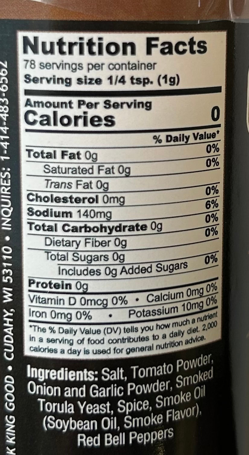 Ingredients: Salt, Tomato Powder, Onion and Garlic Powder, Smoked Torula Yeast, Spice, Smoke Oil (Soybean Oil, Smoke Flavor), Red Bell Peppers