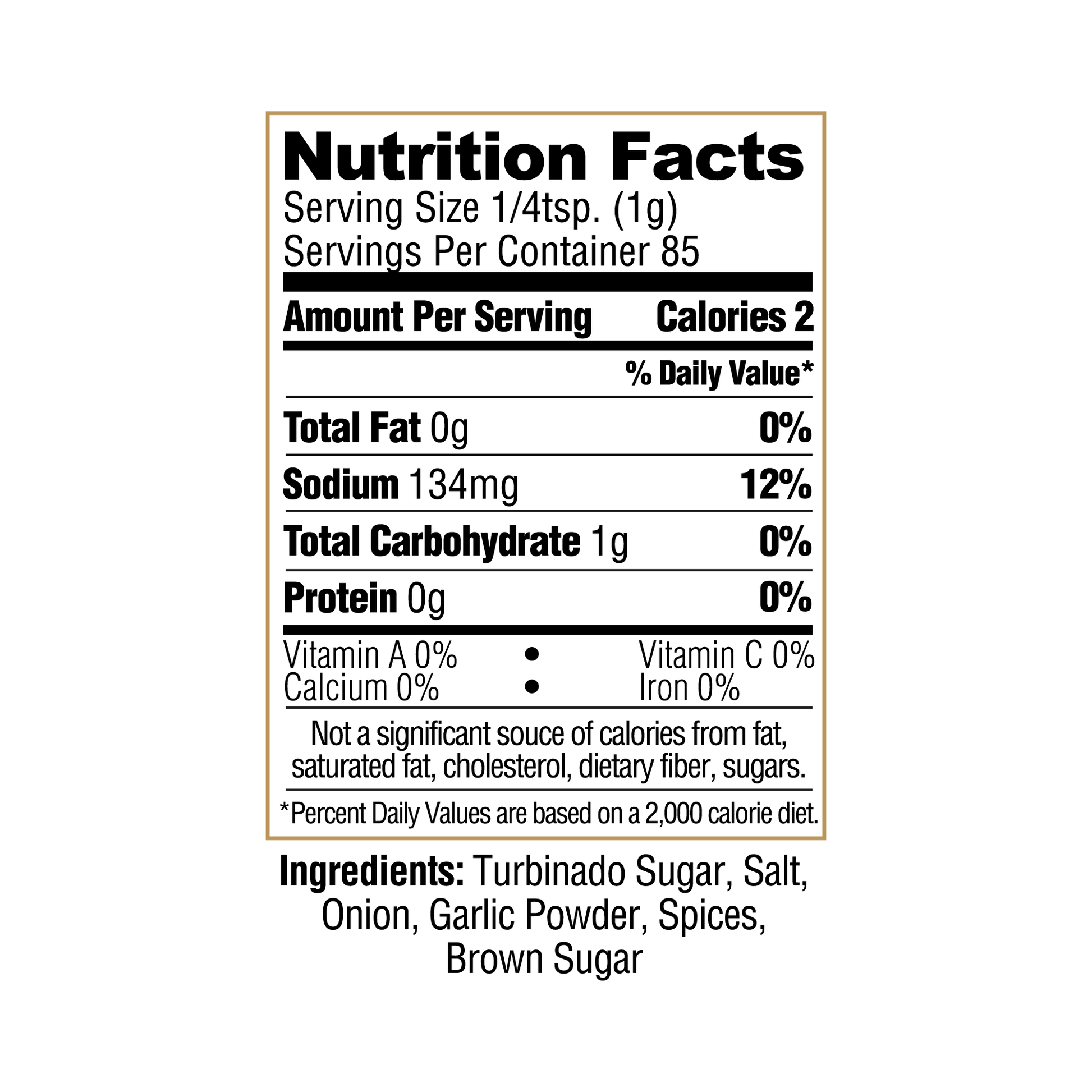 Ingredients: Turbinado Sugar, Salt, Onion, Garlic Powder, Spices, Brown Sugar