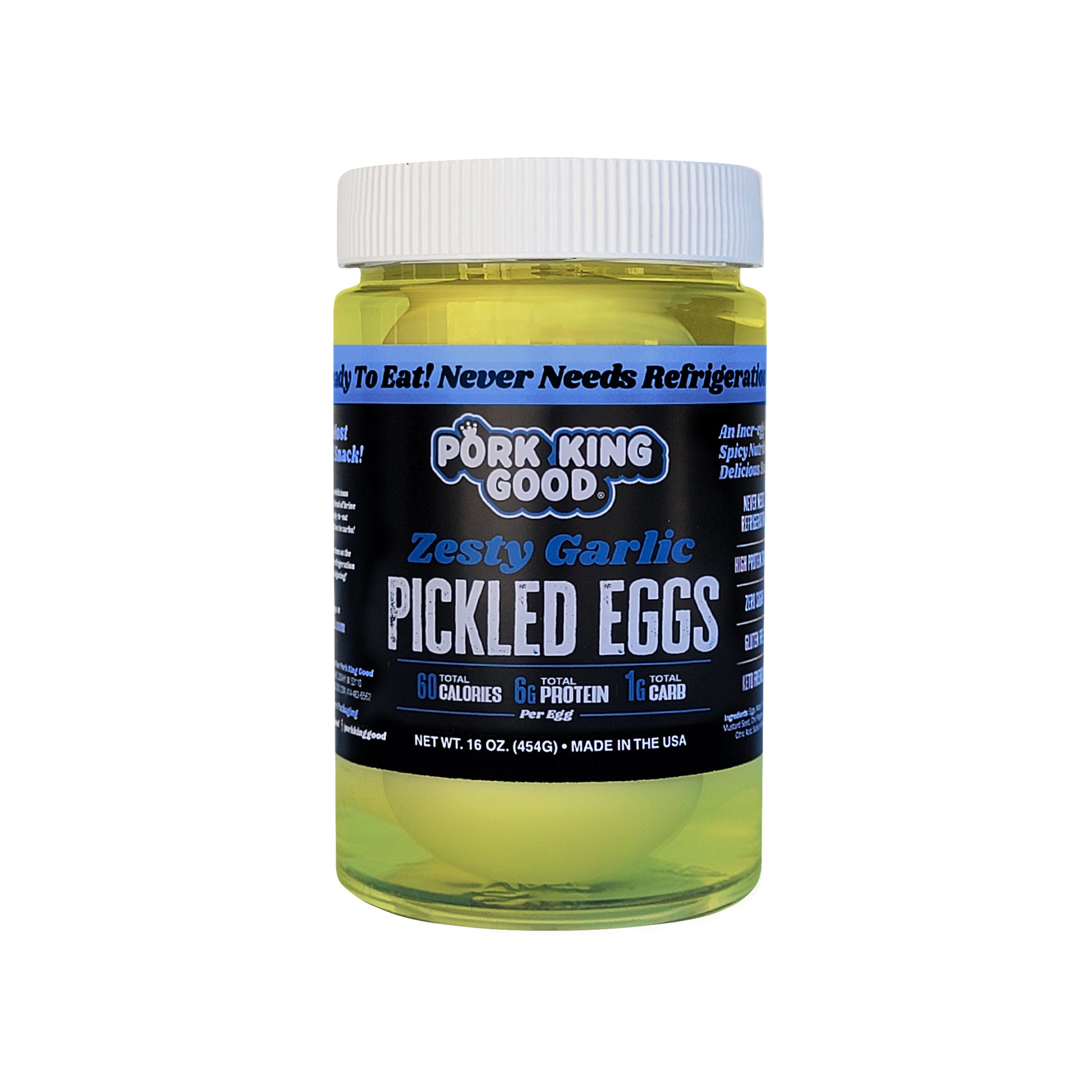 If you can't decide which eggs to try, why not get all three? Pork King Good’s Pickled Eggs combine delicious hard-boiled eggs with a perfectly pickled blend of brine and spices to bring you a delicious, ready-to-eat protein snack! Liven up your charcuterie board or take them on-the-go for barbecues, picnics, camping, or tailgating! Or use them to make one of the best egg salad sandwiches you've ever tried!