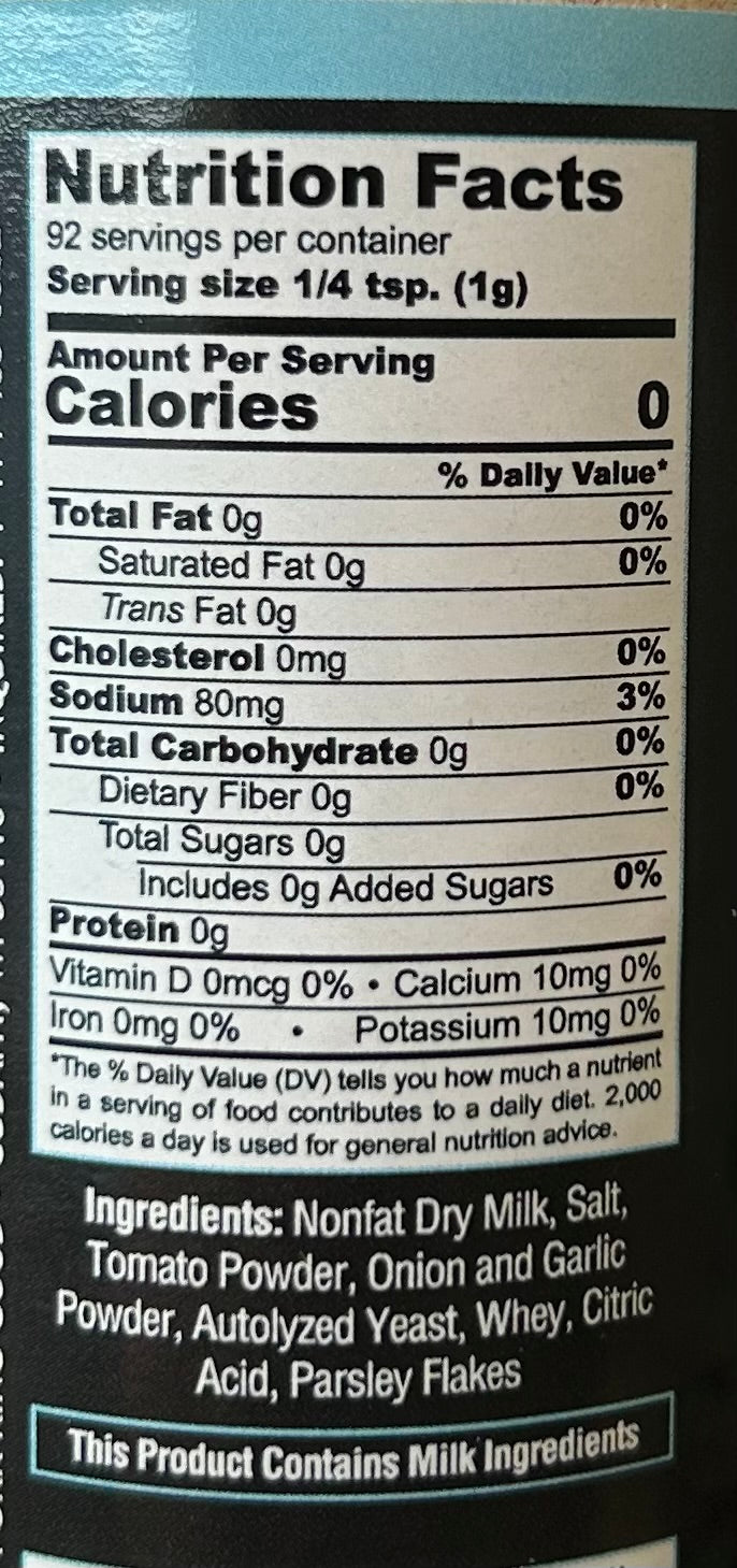 Ingredients: Nonfat dry milk, salt, tomato powder, onion and garlic powder, autolyzed yeast, whey, citric acid, parsley flakes