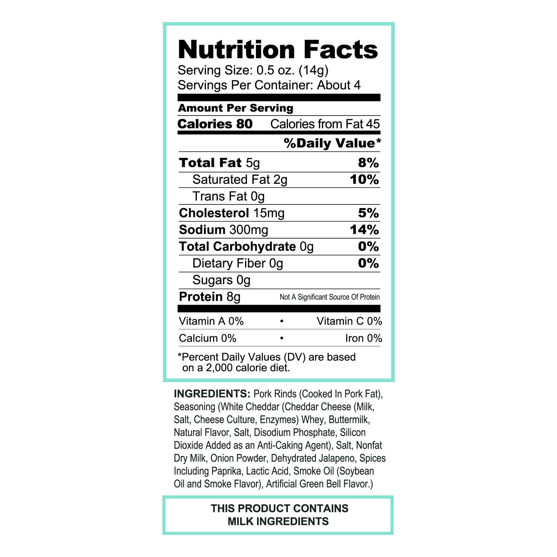 Ingredients: Pork Rinds (Cooked In Pork Fat), White Cheddar (Cheddar Cheese (Milk, Salt, Cheese Culture, Enzymes), Whey, Buttermilk, Natural Flavor, Salt, Disodium Phosphate, Silicon Dioxide Added As An Anti-Caking Agent), Salt, Nonfat Dry Milk, Onion Powder, Dehydrated Jalapeno, Spices Including Paprika, Lactic Acid, Smoke Oil (Soybean Oil And Smoke Flavor), Artificial Green Bell Flavor