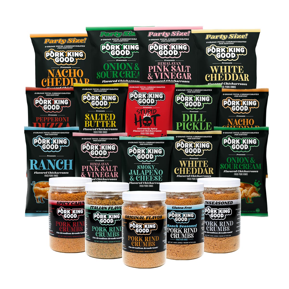 What's even better than a SUPER Sampler? A Super DUPER Sampler! With four jars of our best selling Pork Rind Crumbs included along with ALL of our flavors and sizes of melt-in-your-mouth pork rinds, our Super Duper Sampler is a Pork-King Great way to try everything out (and makes a pretty fantastic keto gift)!